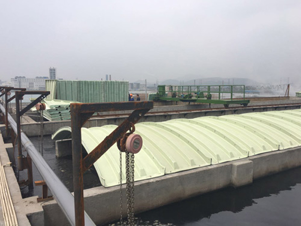 3、輕質高強、安裝方便:玻璃鋼集氣罩比重僅為鋼制品的1/3至1/4,固化程度高,載荷負重大,強度高,適用于大跨度池體,同時蓋板可分為若干小塊,便于運輸、安裝。
